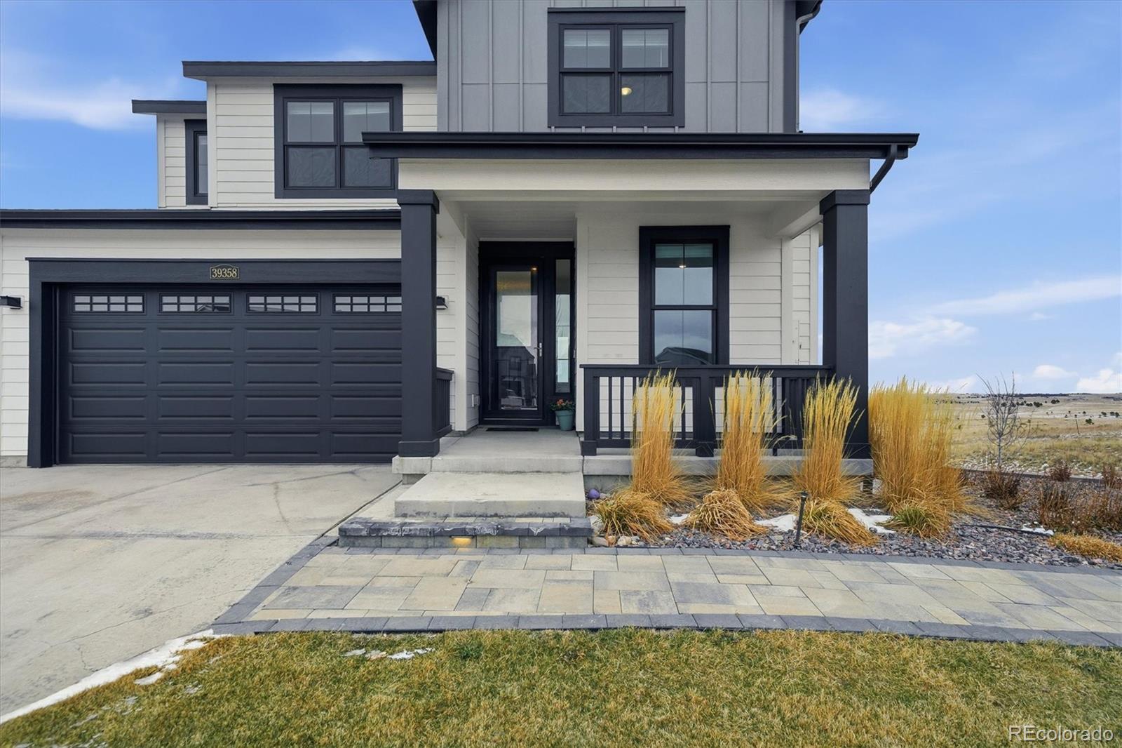 Tucked at the end of a quiet cul-de-sac, this home sits on the best lot in all of Independence. With open space behind plus extra space on each side of the home, it feels private, peaceful, and expansive—like the cul-de-sac is yours alone—with sweeping plains views from nearly every angle. Inside, the home is light, open, and thoughtfully upgraded, blending clean, modern finishes with warm farmhouse-style lighting and design touches. The main level flows beautifully, with a formal office and dining room leading into a huge living room open to the kitchen, ideal for everyday living and entertaining. The kitchen features bright white cabinetry, slab granite countertops, stainless steel appliances, a massive island with seating, and farmhouse-inspired lighting that adds character and charm. Enjoy morning coffee on the covered deck or evenings on the custom brick paver patio surrounded by lush, illuminated landscaping. The walkout basement offers high ceilings and room to grow for future living or recreation space. Upstairs are four spacious bedrooms, including two with walk-in closets, plus convenient upstairs laundry. The primary suite is a true retreat with open-space views, an upgraded walk-in shower, slab granite counters, and a huge walk-in closet with real wood built-ins. Additional highlights include upgraded luxury carpet and pad, LVP flooring, stylish shiplap accents, cordless blinds, Milgard single-hung windows, a whole-home humidifier, and farmhouse-style fixtures. New windows, exterior paint, and a Class 4 roof were completed March 2025. Central A/C, a radon system, upgraded 8-foot garage doors, and a fully insulated and drywalled 3-car garage complete the home. NO HOA fee, plus a community outdoor pool, playgrounds, fitness center & clubhouse all with quick & easy access to Parker or Elizabeth just 13 minutes away. This is more than a home—it’s space, views, thoughtful design, and a lifestyle that’s hard to find.