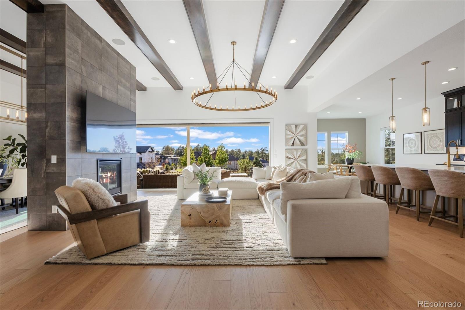 Dimensions - 17 x 26Level - MainDescription - 12 Foot Beamed Ceilings, RH Light Fixture, Custom Double Sided Gas Fireplace, 24 Foot Sliding Doors Open to the Expansive Outdoor Patio, Surround Sound